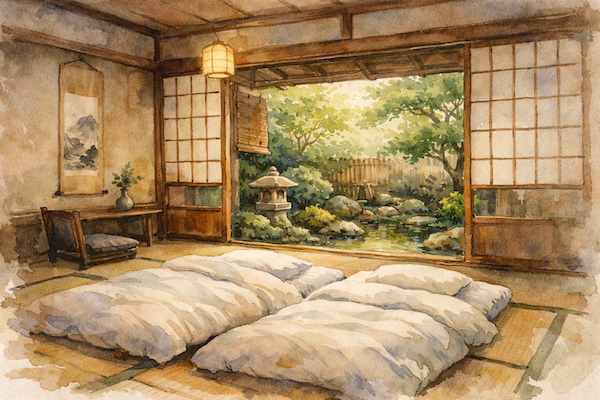 Futons are laid out in the evening while you are at dinner or bathing. They are firmer than a typical UK mattress but carefully layered and surprisingly supportive.
