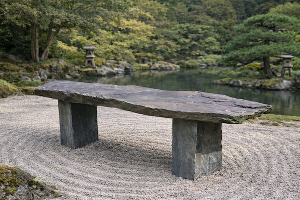 A hand-crafted stone bench formed from a naturally split slate slab, supported by two solid stone uprights. Set within a tranquil Japanese garden, the bench rests on raked gravel beside still water, framed by mature trees and mossed stones. Its organic form celebrates natural texture, balance, and quiet contemplation.