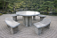 A refined granite garden dining set featuring a circular polished table and four curved stone benches. Set within a formal Japanese garden on raked gravel, the ensemble combines symmetry, craftsmanship, and natural stone textures, creating an elegant focal point for contemplative outdoor dining and tranquil garden settings.